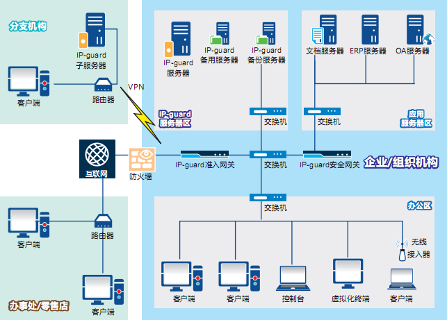 终端安全管理(endpoint security management)是一种保护网络安全的策略式方法,它需要终端设备在得到访问网络资源的许可之前遵从特定的标准。常见的产品品牌(IPguard终端安全管理、360终端安全管理、亚信终端安全管理等等),通常方案原理和组网如图所示: