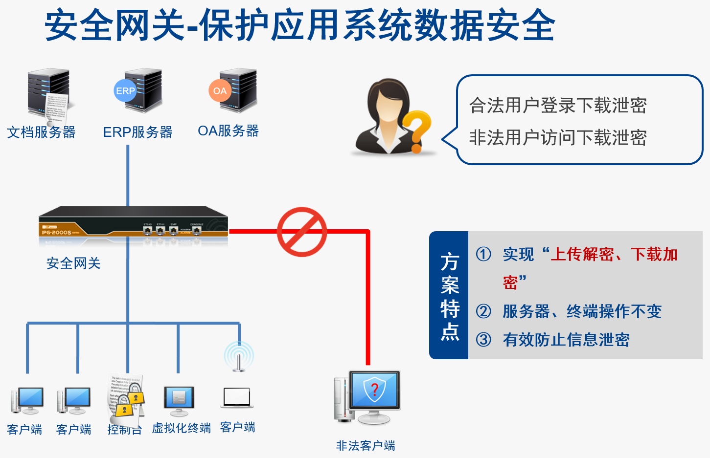 数据安全保护系统是依据国家重要信息系统安全等级保护标准和法规,以及企业数字知识产权保护需求,自主研发的产品。它以全面数据文件安全策略、加解密技术与强制访问控制有机结合为设计思想,对信息媒介上的各种数据资产,实施不同安全等级的控制,有效杜绝机密信息泄漏和窃取事件。产品特点: