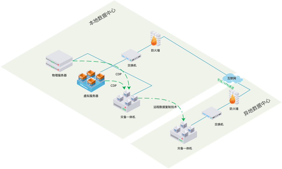 同城灾备中心与异地灾备中心之间采用异步复制方式,定期将数据进行复制备份,异步复制支持增量复制方式,可以节省数据备份的带宽占用,缩短数据的备份时间。