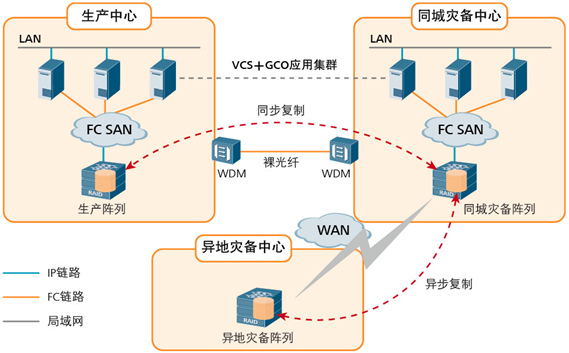 在网络层,同城双中心之间采用光纤连接,保证双中心之间较大的带宽,以响应实时的业务数据需求,同城异地之间采用专网或IP广域网即可实现,以节约成本。同城双中心的光纤采用波分复用(WDM)技术进行建设,针对两地只有1条或2条光纤连接的场景,采用WDM方式,能够虚拟出多条FC或GE联络,满足两地之间对业务和数据多重链路的需求。WDM技术能充分利用光纤的巨大带宽资源,大幅度提高系统传输容量,降低传输成本,因此在长途和骨干网的超大容量传输中得到了广泛的应用。将WDM技术引入城域网、接入网,整个网络就会变成无缝连接的整体,为所有不同的业务提供支持和连接,因此城域网中WDM具有很大优越性。