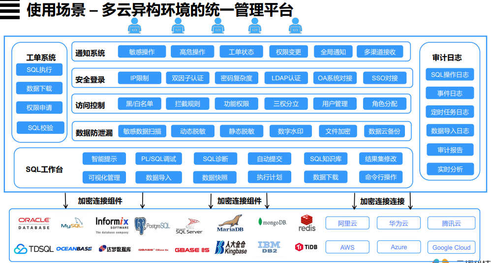 数据安全管理平台是旨在帮助用户构建一个安全、统一、易用的数据库访问控制平台,以数据安全为中心,结合智能运维,通过事前审批、事中控制、事后审计将审批、控制和追责有效结合,进而实现全链路管控,保障整个数据处理生命周期的安全。常见品牌:云趣QueryX,美创Meichuang,华云等等